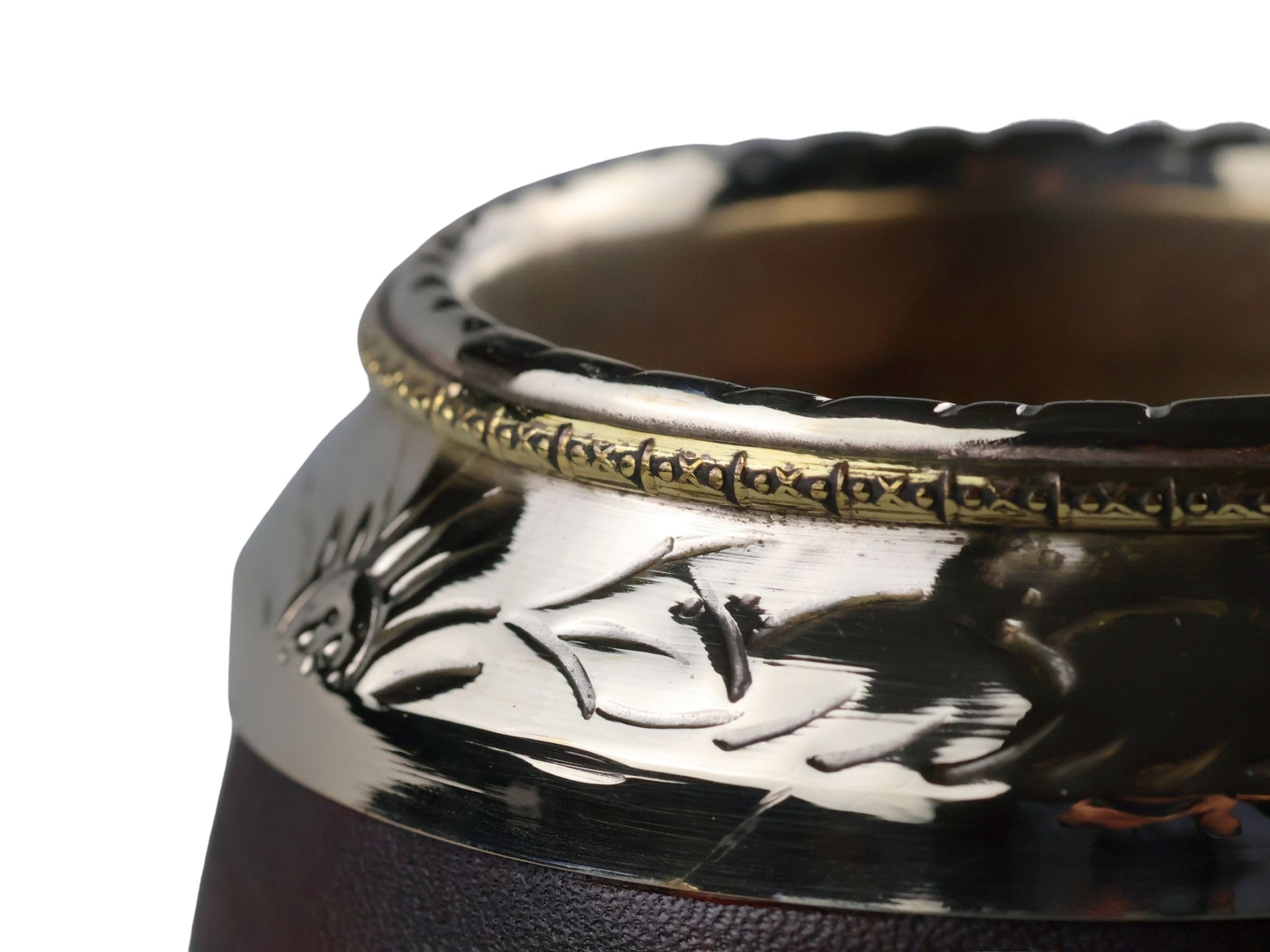 Deze premium kalebas combineert traditioneel vakmanschap met een stijlvolle, elegante uitstraling. De brede, geciseleerde alpaca ring met bloemenmotief geeft de kalebas een rijke, verfijnde look, terwijl het gladde donkerbruine leer de klassieke torpedovorm mooi accentueert. De bijpassende leren voet zorgt ervoor dat de kalebas stevig staat.