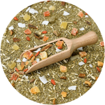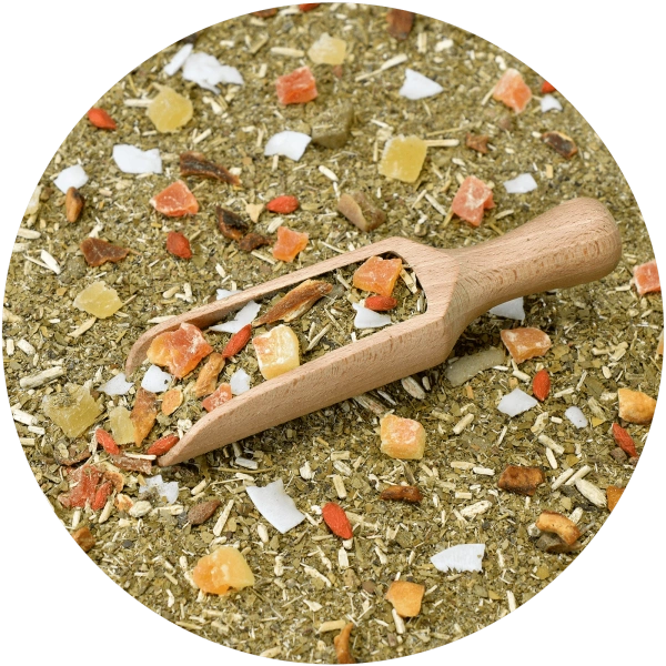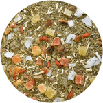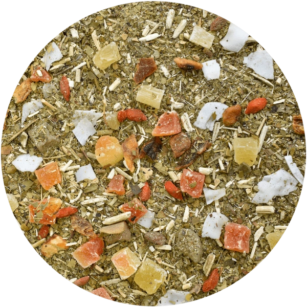 Guarani Exotic Rain Guarani Exotic Rain literally takes you to a tropical island! The characteristic, intense flavor of yerba mate dried with fire and smoke combines surprisingly well with exotic ingredients: slightly sour goji berries, dried mango pieces, sweet pieces of candied pineapple and papaya and tart orange peel. Delicate sweetness and ethereal depth is added by large white coconut flakes. This is a great option for lovers of original fusions. Highly recommended