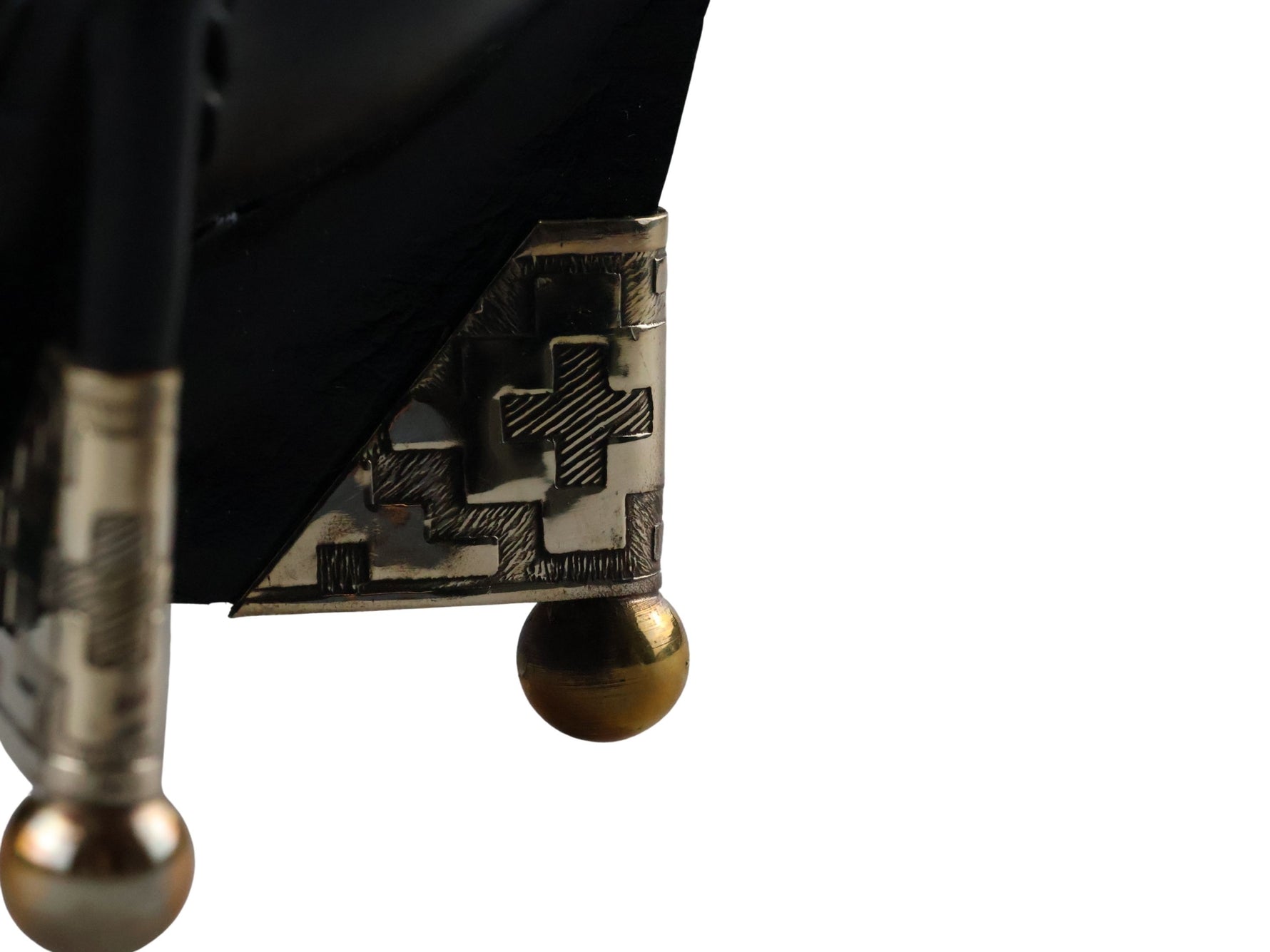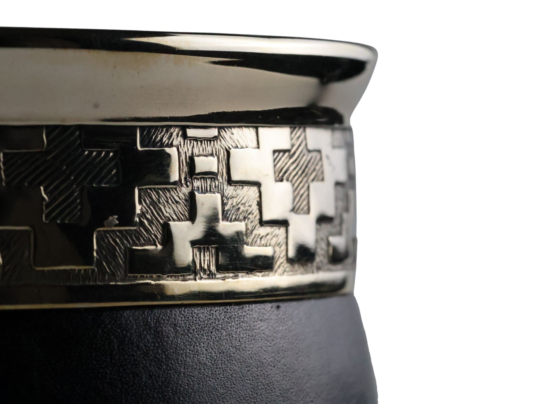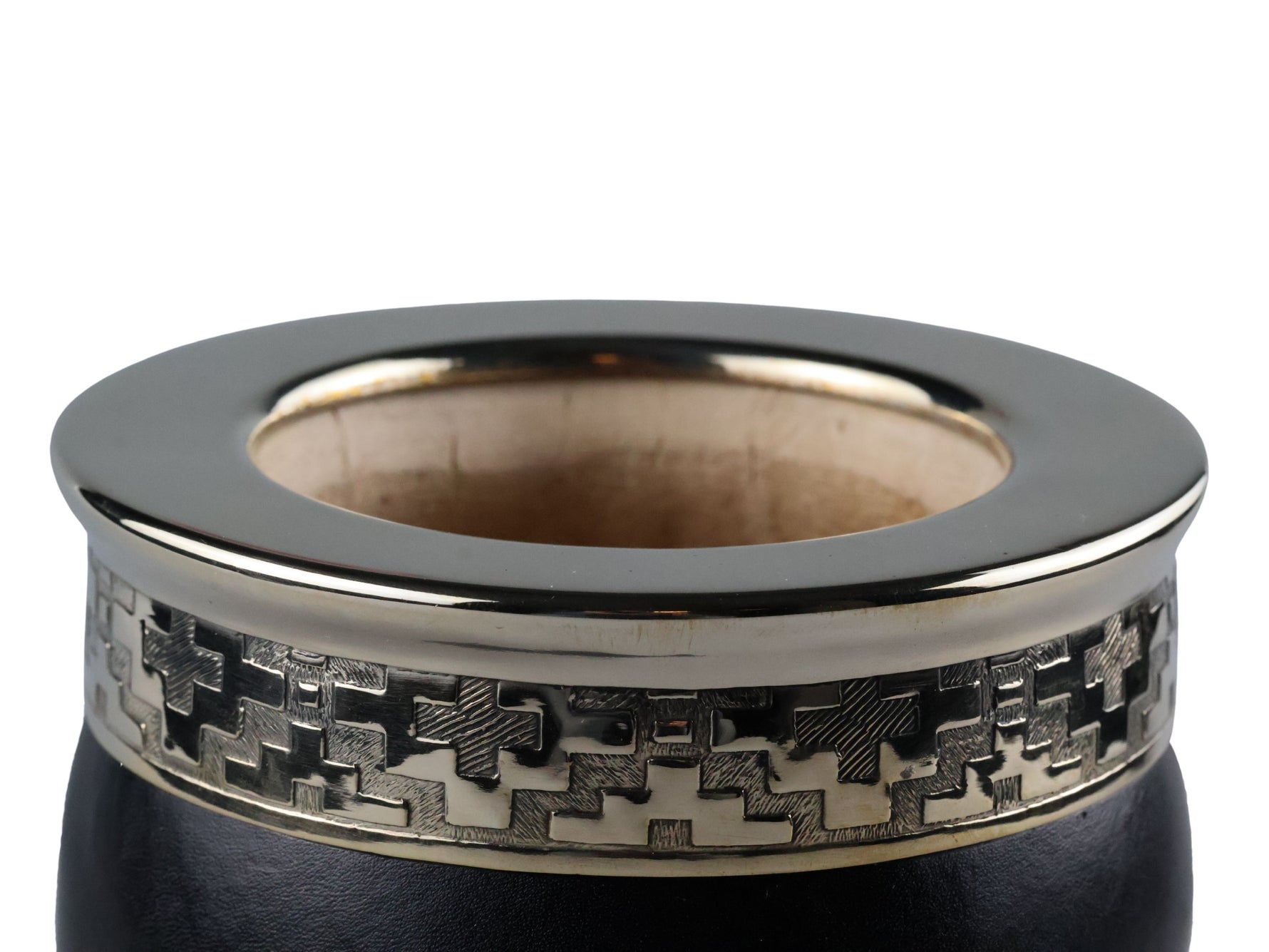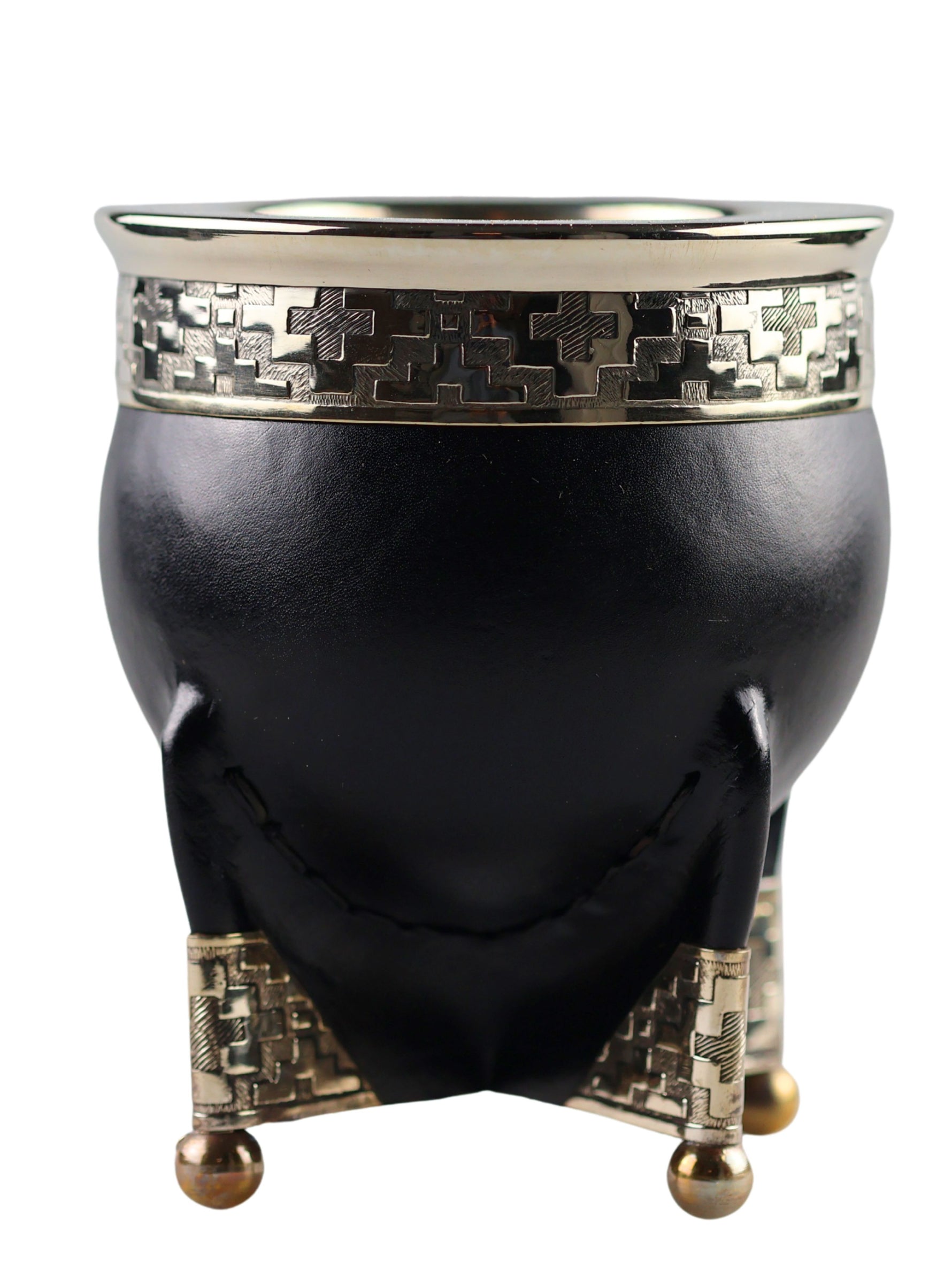 Een opvallend stijlvolle kalebas met een modern karakter. De Imperial Goldsmith Black combineert strak, glad zwart leer met een brede alpaca ring in een opvallend geometrisch kruismotief. Bijzonder aan dit model zijn de bijpassende alpaca voetjes met hetzelfde patroon en gouden bolvormige accenten, die de kalebas een luxueuze en eigentijdse uitstraling geven.